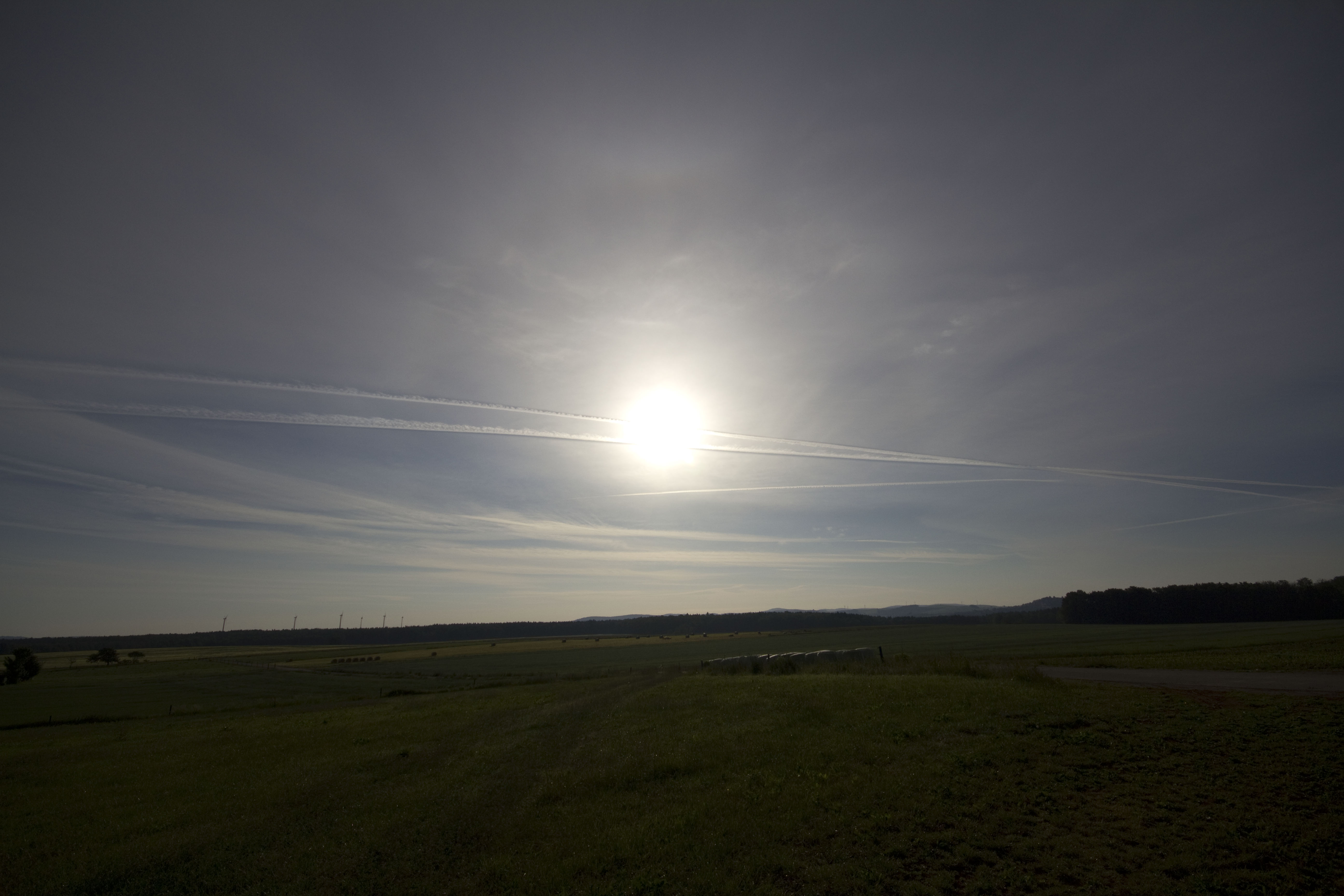 Die Kondensstreifen verursachten sehr deutliche Schatten am Himmel. Das 22° Halo fiel mir erst beim Durchsehen der Aufnahmen am Rechner auf. In der unscharf maskierten Version ist es noch mal deutlich zu sehen.