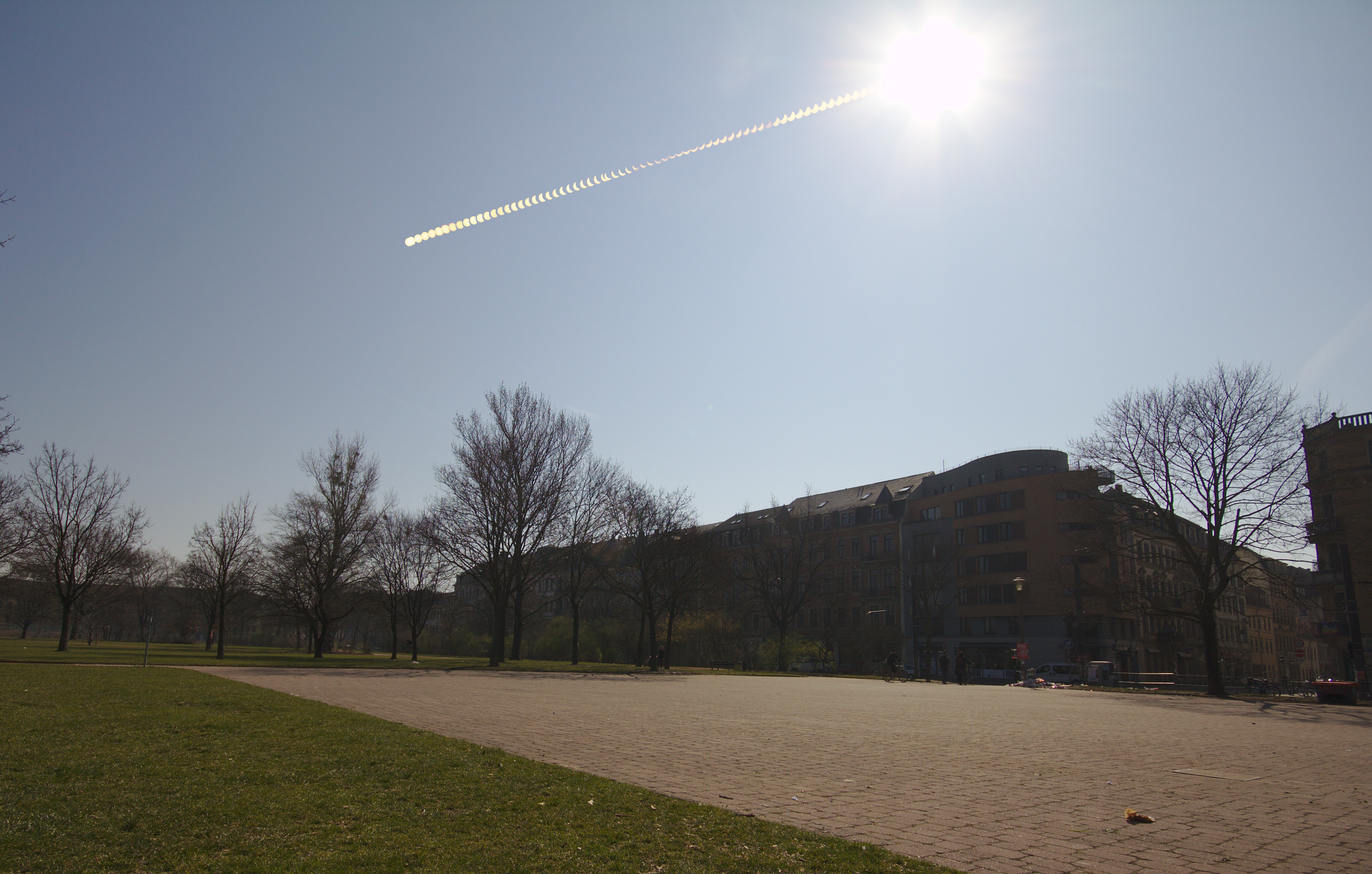 Bild #1 wurde mit einer Canon EOS 550D und dem Sigma 10-20mm f4-5.6@ 10mm f8 bei 1/500s, ISO 100 erstellt. Als Filter diente eine doppelte Rettungsfolie (ACHTUNG! NUR FOTOGRAFISCH EINSETZBAR! Siehe Transmissionskurve: http://www.sonnen-filter.de/Filter-1/SENADA-log.gif ). Die Kamera hat alle zwei Minuten ein Bild geschossen, welche danach per Maximum gestackt und in ein Bild ohne Filter eingefügt wurden (aufhellen).